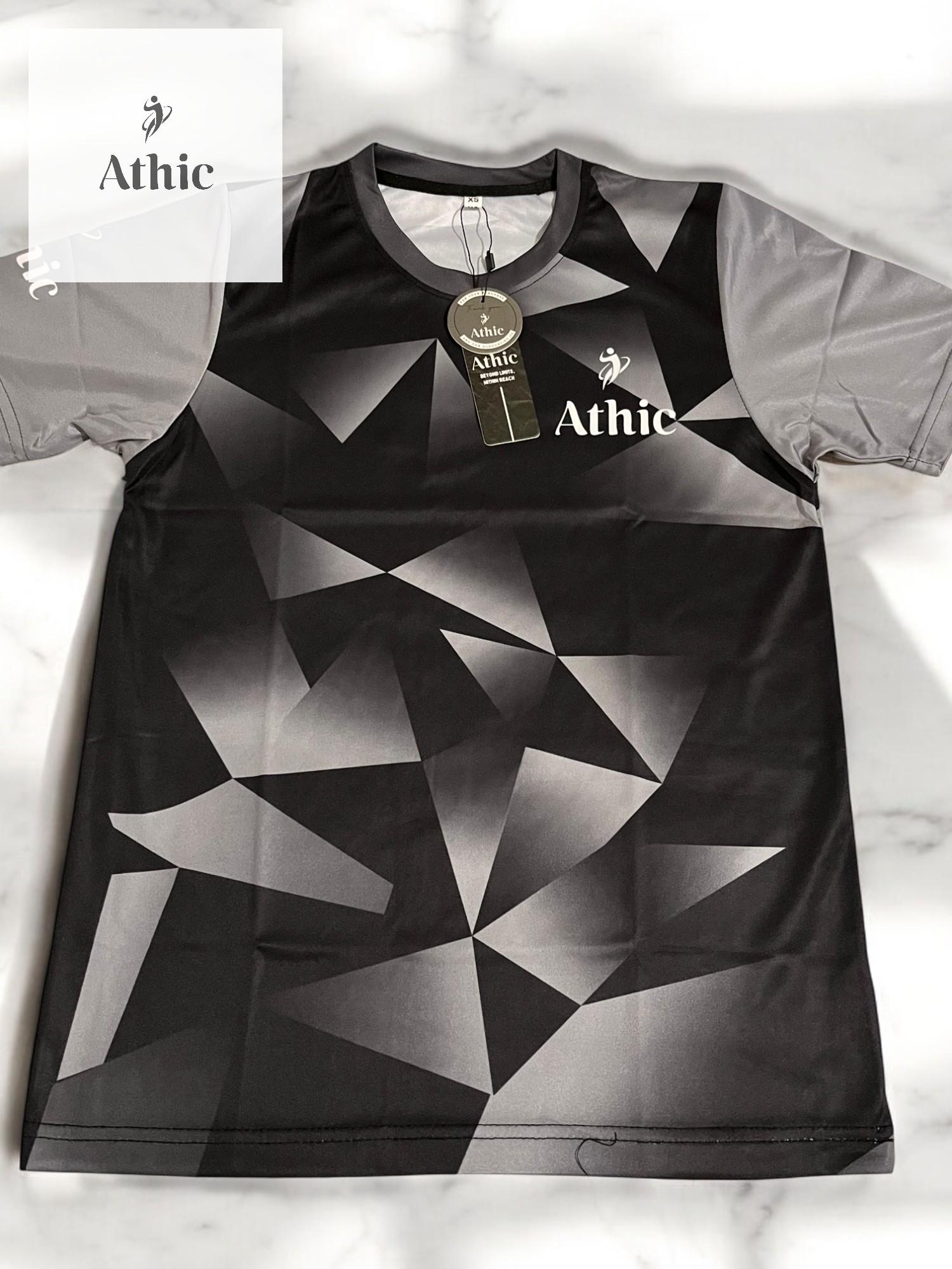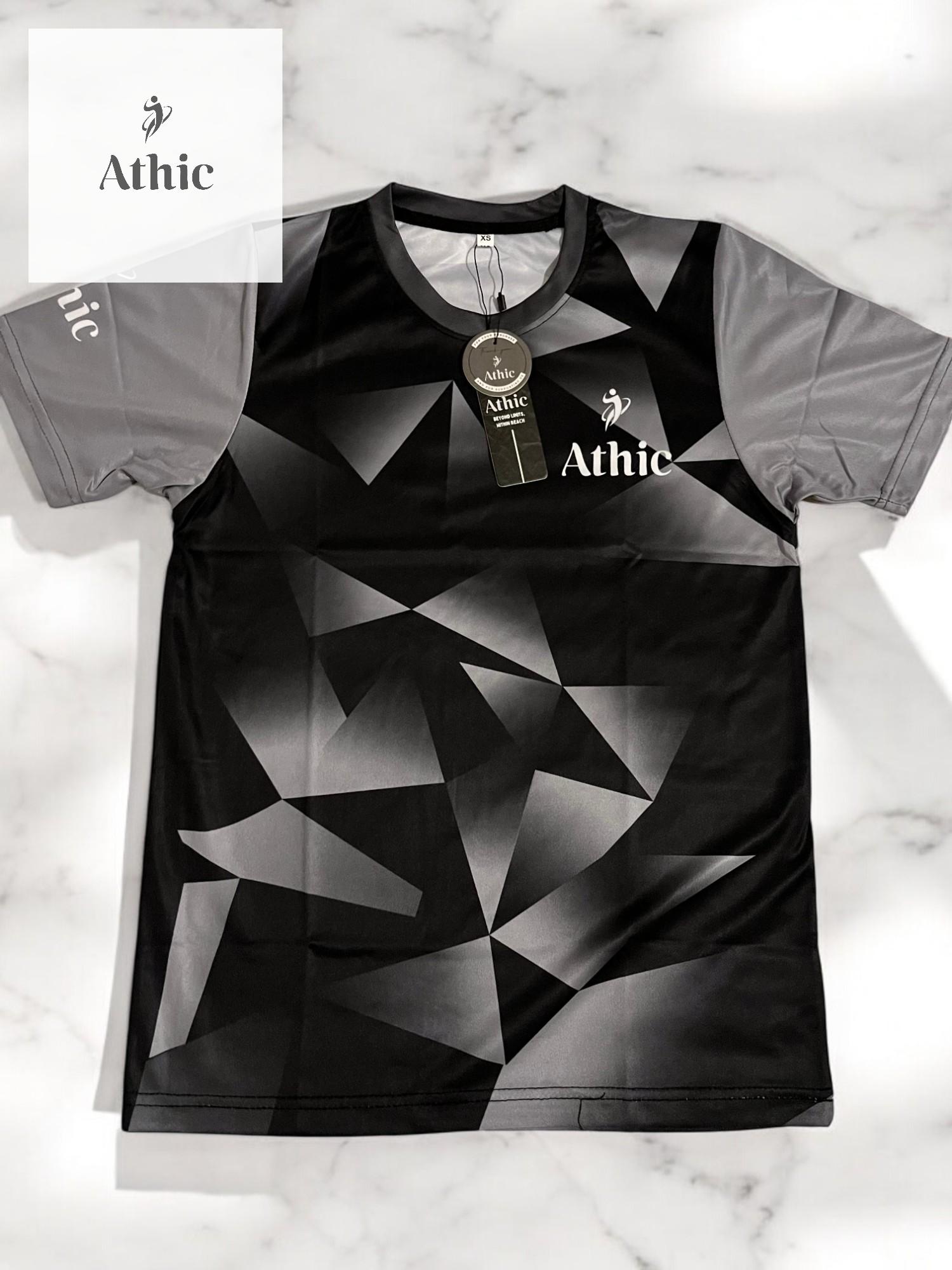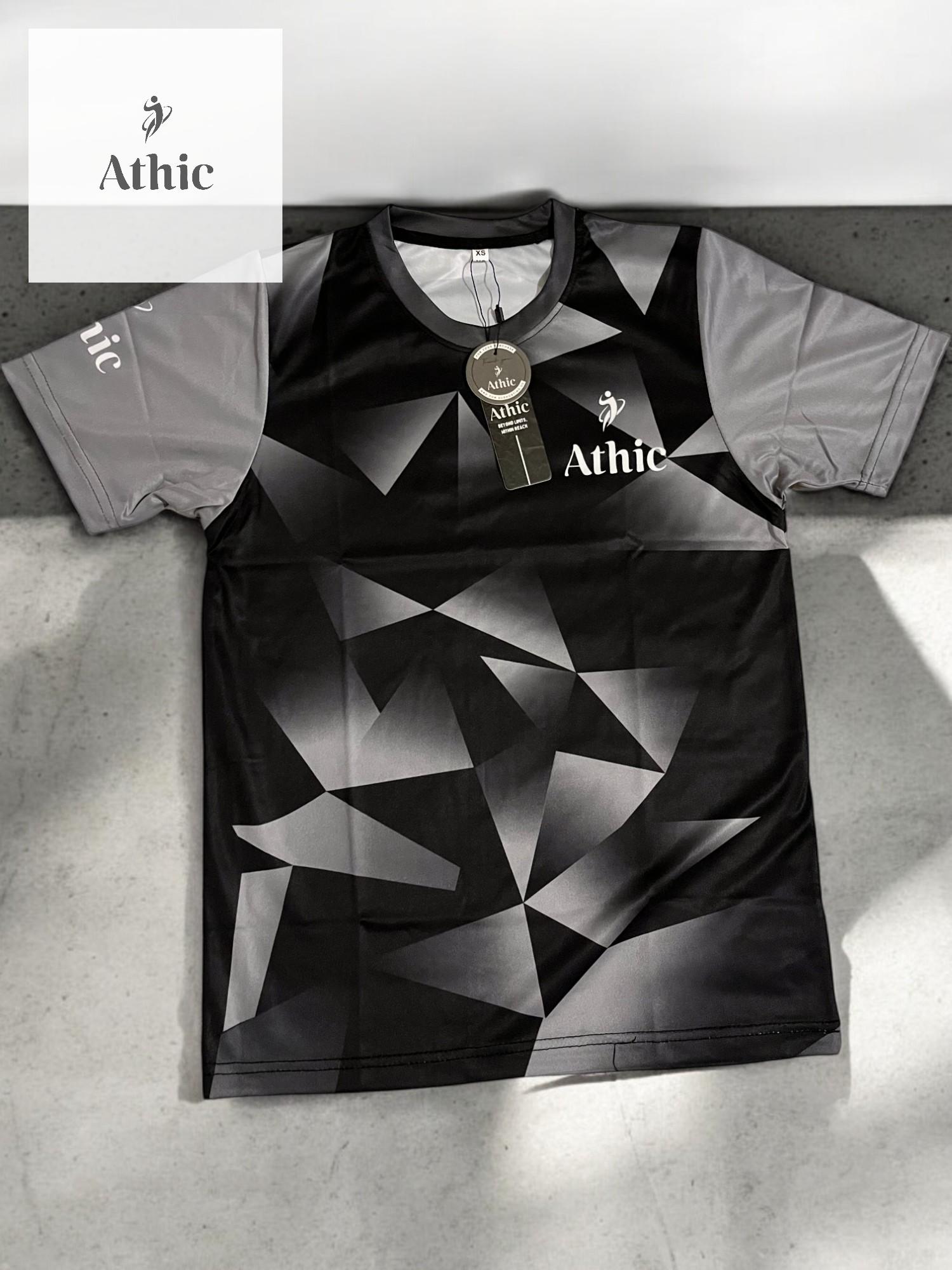 Unleash your active energy with the Athic Geometric Black Sports Tee — where cutting-edge style meets athletic performance. This dynamic shirt features a striking geometric pattern in gradients of black and grey, delivering a bold, modern aesthetic. The sleeves contrast in a sleek grey tone, highlighted with the “Athic” branding for an extra edge of identity.