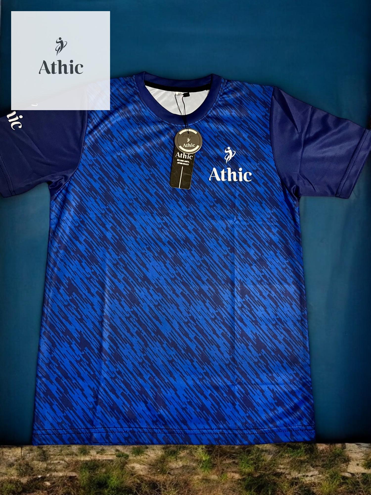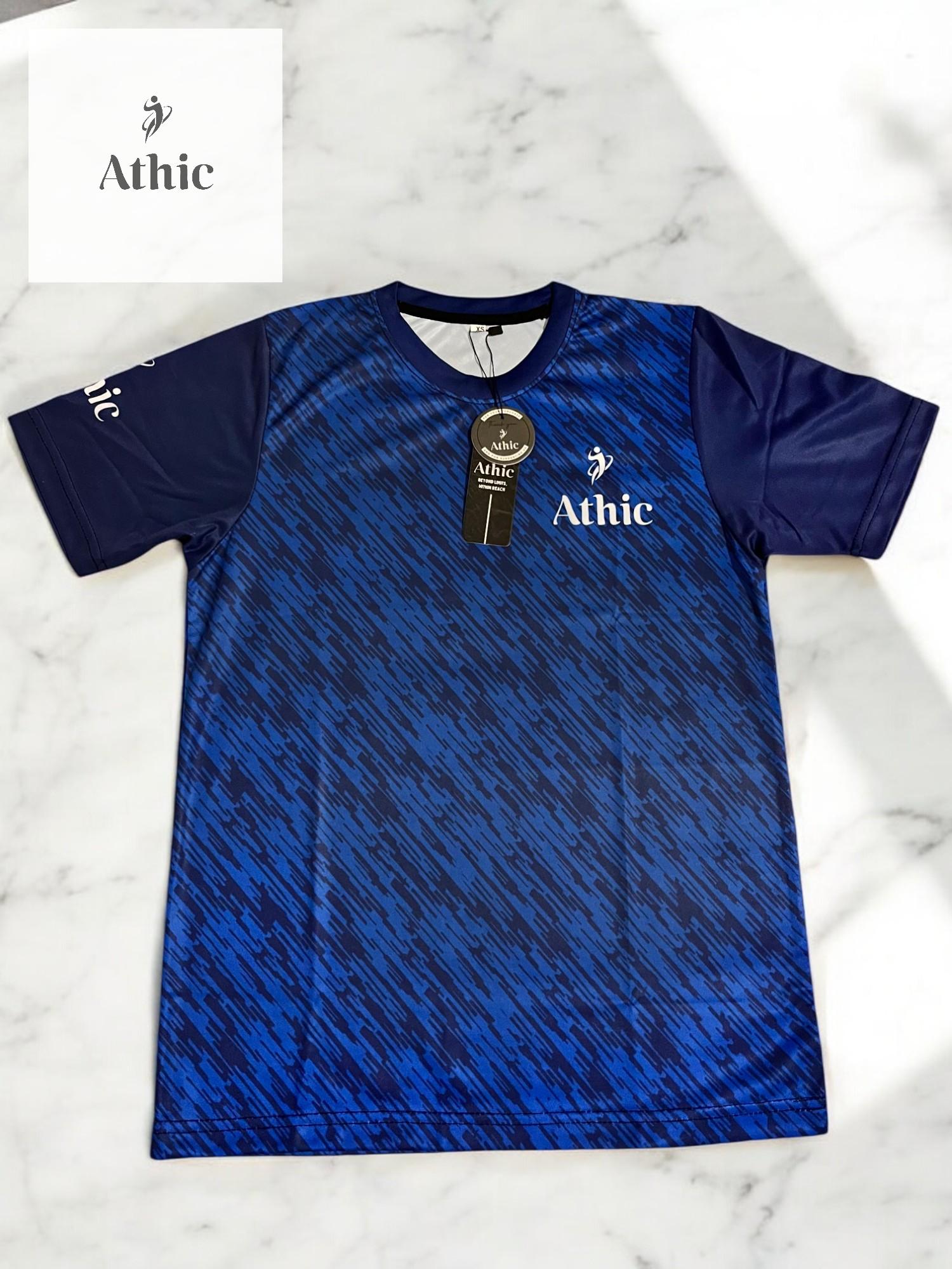 Elevate your sportswear game with the Athic Velocity Tee, designed in a striking blue gradient with a dynamic diagonal pattern. This high-performance tee is made from breathable, sweat-wicking material that keeps you cool under pressure. The sleek navy sleeves and minimal white logo detailing make it versatile for both sport and streetwear. Velocity isn’t just about speed—it’s about power, comfort, and unmistakable style.